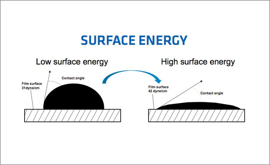 Figure shows absolute values of surface energy for solid materials and the surface tension of many plastics including polyethylene and polypropylene is often insufficient for bonding or printing. These materials have very useful properties such as chemical inertness, a low coefficient of friction, high wear, puncture and tear resistance, etc. However, the poor wettability of these polymers presents the designer with the problem of bonding or decorating these materials. Surface treatment can improve wettability of the material by raising the material’s surface energy and positively affect adhesive characteristics by creating bonding sites. The most advanced and successful methods of surface treatment are based on a principle of high voltage discharge in air.