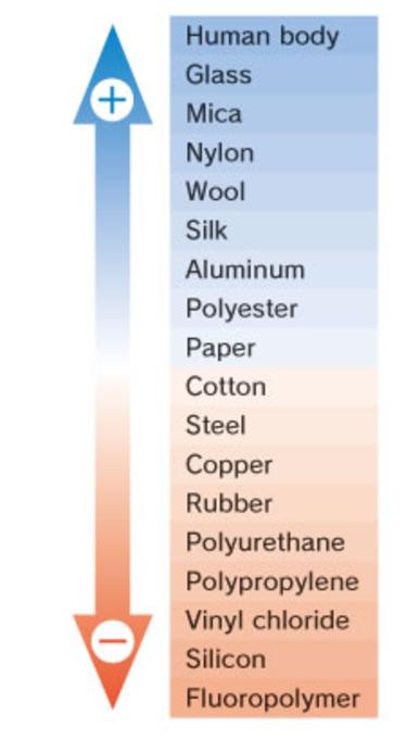 The Triboelectric Series is a list of materials, showing which have a greater tendency to become positive (+) and which have a greater tendency to become negative (−). The list is a handy tool to determine which combinations of materials create the most static electricity.